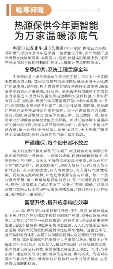 今日零时,供暖正式开始,郑州燃气保供体系今年迎来新一轮智慧化升级,多个热源厂加装远程在线监测设备,实现压力、温度、流量实时数据上传,还可在突发情况下远程控制阀门启闭,大幅提升应急响应效率。(今日《郑州日报》1版)