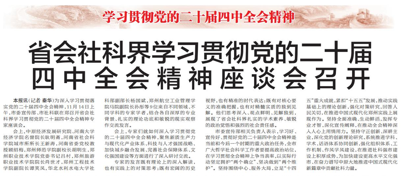 为深入学习贯彻落实党的二十届四中全会精神,11月14日上午,市委宣传部、市社科联在郑召开省会社科界学习贯彻党的二十届四中全会精神专家座谈会。(今日《郑州日报》2版)