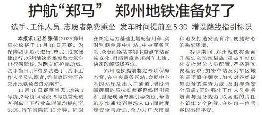 2025郑州马拉松将于11月16日开赛。为保障赛事顺利进行,市民、跑友便捷出行,郑州地铁多维度发力筑牢出行保障线,为跑友们护航助威。赛事当日,所有参赛选手、赛事工作人员及志愿者,凭有效证件可在郑州地铁免费进站乘车。(今日《郑州日报》2版)