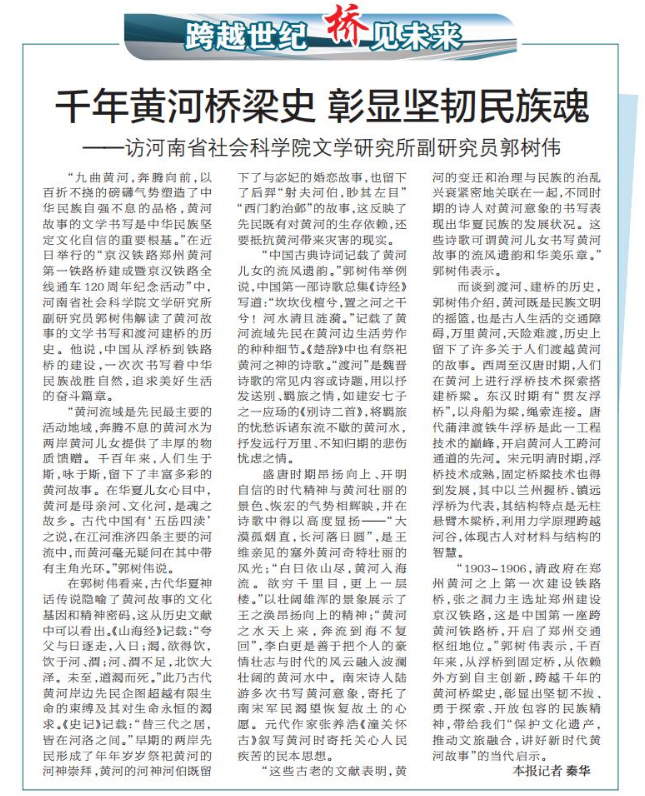 “九曲黄河,奔腾向前,以百折不挠的磅礴气势塑造了中华民族自强不息的品格,黄河故事的文学书写是中华民族坚定文化自信的重要根基。”在近日举行的“京汉铁路郑州黄河第一铁路桥建成暨京汉铁路全线通车120周年纪念活动”中,河南省社会科学院文学研究所副研究员郭树伟解读了黄河故事的文学书写和渡河建桥的历史。他说,中国从浮桥到铁路桥的建设,一次次书写着中华民族战胜自然,追求美好生活的奋斗篇章。(今日《郑州日报》2版)