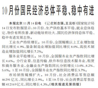 10月份国民经济总体平稳、稳中有进