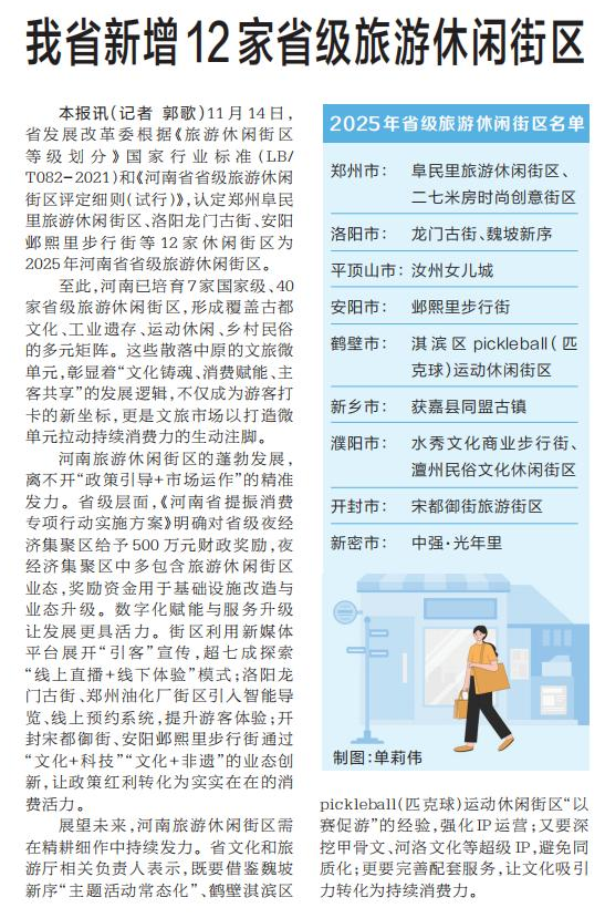 11月14日,省发展改革委根据《旅游休闲街区等级划分》国家行业标准(LB/T082-2021)和《河南省省级旅游休闲街区评定细则(试行)》,认定郑州阜民里旅游休闲街区、洛阳龙门古街、安阳邺熙里步行街等12家休闲街区为2025年河南省省级旅游休闲街区。(今日《河南日报》1版)