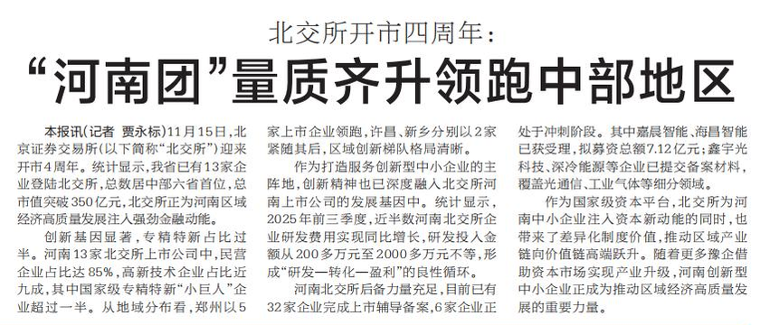 北交所开市四周年:“河南团”量质齐升领跑中部地区