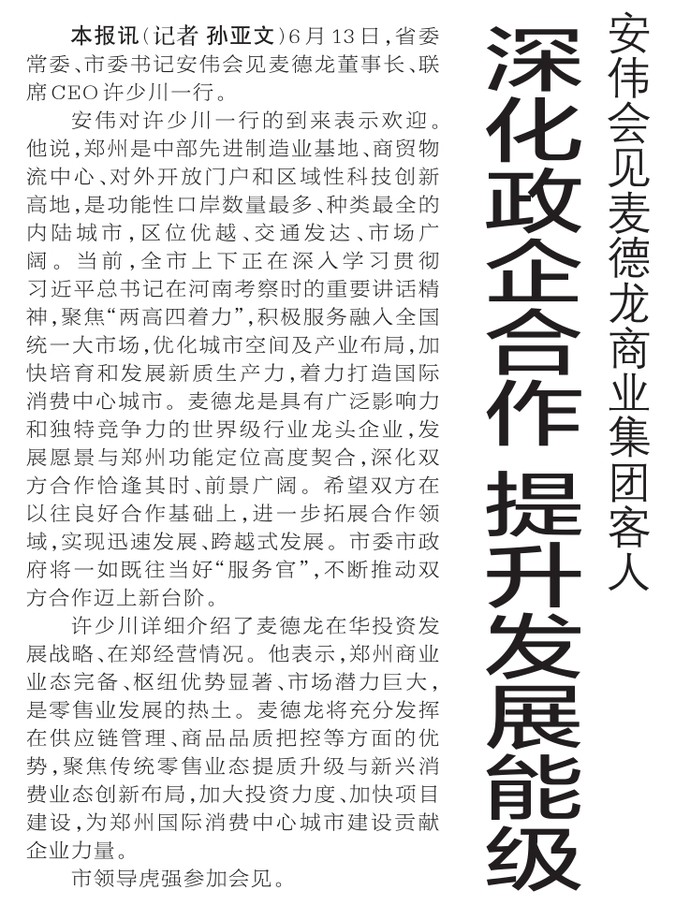 6月13日,省委常委、市委书记安伟会见麦德龙董事长、联席CEO许少川一行。(今日《郑州日报》1版)