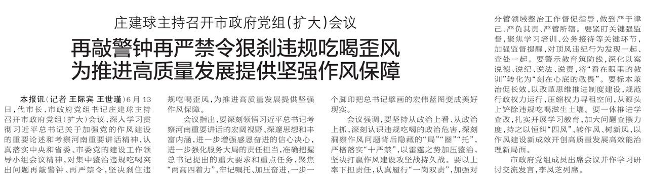 6月13日,代市长、市政府党组书记庄建球主持召开市政府党组(扩大)会议,深入学习贯彻习近平总书记关于加强党的作风建设的重要论述和考察河南重要讲话精神,认真落实中央和省委、市委党的建设工作领导小组会议精神,对集中整治违规吃喝突出问题再敲警钟、再严禁令,坚决刹住违规吃喝歪风,为推进高质量发展提供坚强作风保障。(今日《郑州日报》1版)