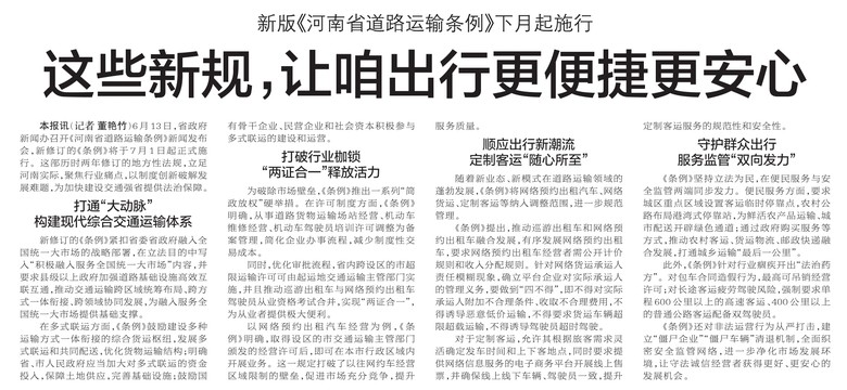 6月13日,省政府新闻办召开《河南省道路运输条例》新闻发布会,新修订的《条例》将于7月1日起正式施行。这部历时两年修订的地方性法规,立足河南实际,聚焦行业痛点,以制度创新破解发展难题,为加快建设交通强省提供法治保障。(今日《郑州日报》2版)