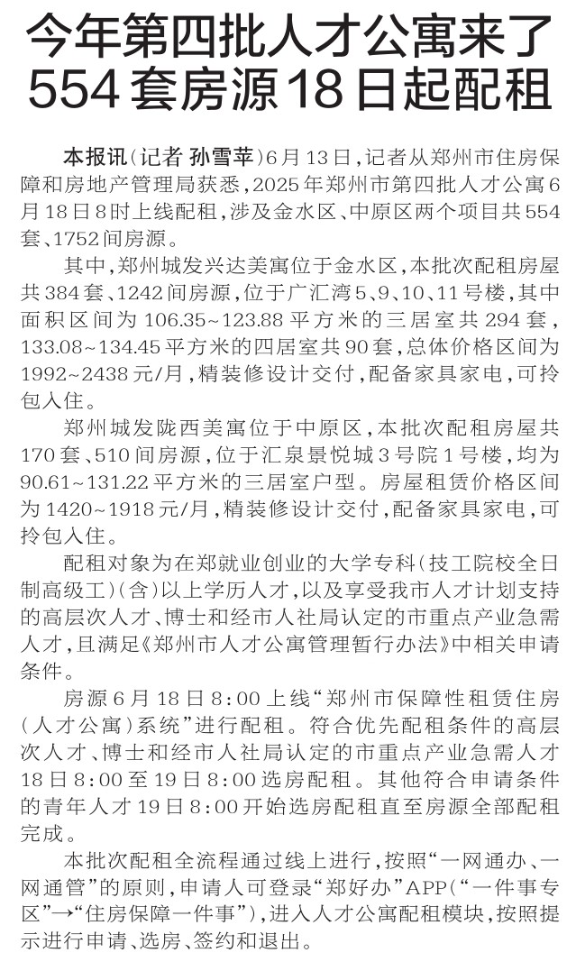 6月13日,记者从郑州市住房保障和房地产管理局获悉,2025年郑州市第四批人才公寓6月18日8时上线配租,涉及金水区、中原区两个项目共554套、1752间房源。(今日《郑州日报》2版)