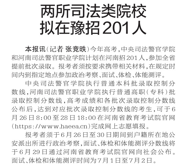 今年高考,中央司法警官学院和河南司法警官职业学院计划在河南招201人,参加全省提前批次录取。报考者须按要求携带相关材料,在规定时间内到指定地点参加政治考察、面试、体检、体能测评。(今日《郑州日报》2版)