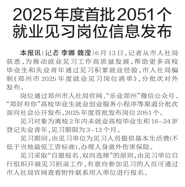 6月13日,记者从市人社局获悉,为推动就业见习工作高质量发展,帮助更多高校毕业生和失业青年通过见习积累就业经验,市人社局编制《郑州市2025年度就业见习岗位清单》,分批次对外发布。(今日《郑州日报》2版)