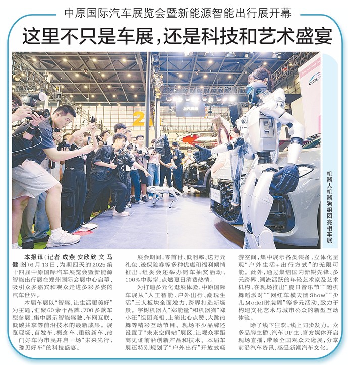 6月13日,为期四天的2025第十四届中原国际汽车展览会暨新能源智能出行展在郑州国际会展中心启幕,吸引众多嘉宾和观众走进多彩多姿的汽车世界。(今日《郑州日报》2版)