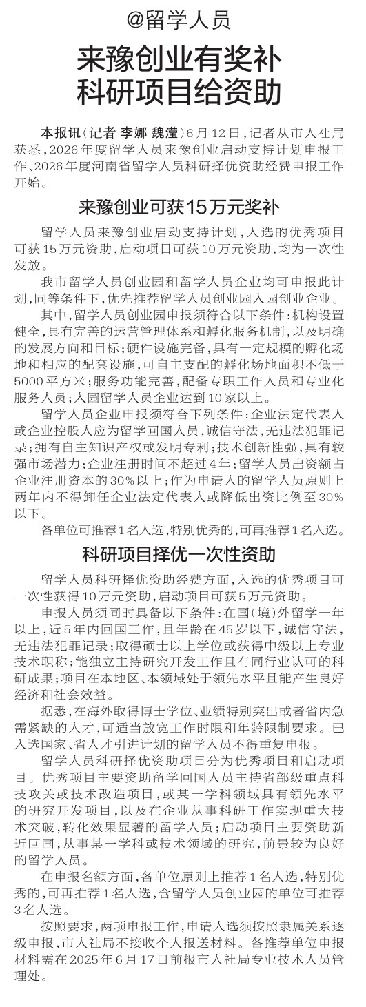 6月12日,记者从市人社局获悉,2026年度留学人员来豫创业启动支持计划申报工作、2026年度河南省留学人员科研择优资助经费申报工作开始。(今日《郑州日报》2版)