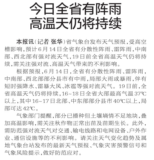 省气象台发布天气预报,受高空槽影响,预计6月14日全省有分散性阵雨、雷阵雨,中南部、西北部有强对流天气,19日前全省高温天气仍将持续,需关注强对流、高温天气带来的不利影响。(今日《郑州日报》2版)