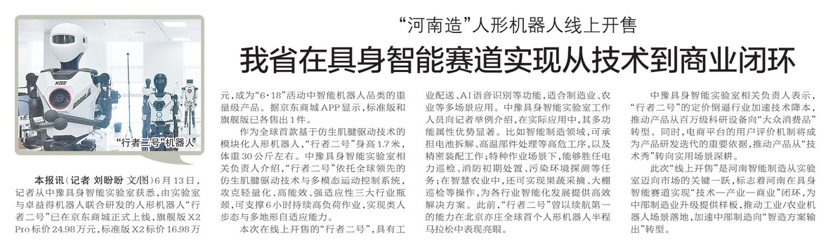 6月13日,记者从中豫具身智能实验室获悉,由实验室与卓益得机器人联合研发的人形机器人“行者二号”已在京东商城正式上线,旗舰版X2 Pro标价24.98万元,标准版X2标价16.98万元,成为“6·18”活动中智能机器人品类的重量级产品。据京东商城APP显示,标准版和旗舰版已各售出1件。(今日《郑州日报》2版)