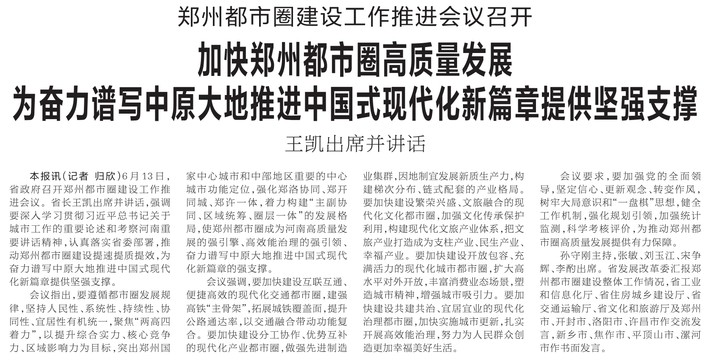 6月13日,省政府召开郑州都市圈建设工作推进会议。省长王凯出席并讲话,强调要深入学习贯彻习近平总书记关于城市工作的重要论述和考察河南重要讲话精神,认真落实省委部署,推动郑州都市圈建设提速提质提效,为奋力谱写中原大地推进中国式现代化新篇章提供坚强支撑。(今日《河南日报》1版)