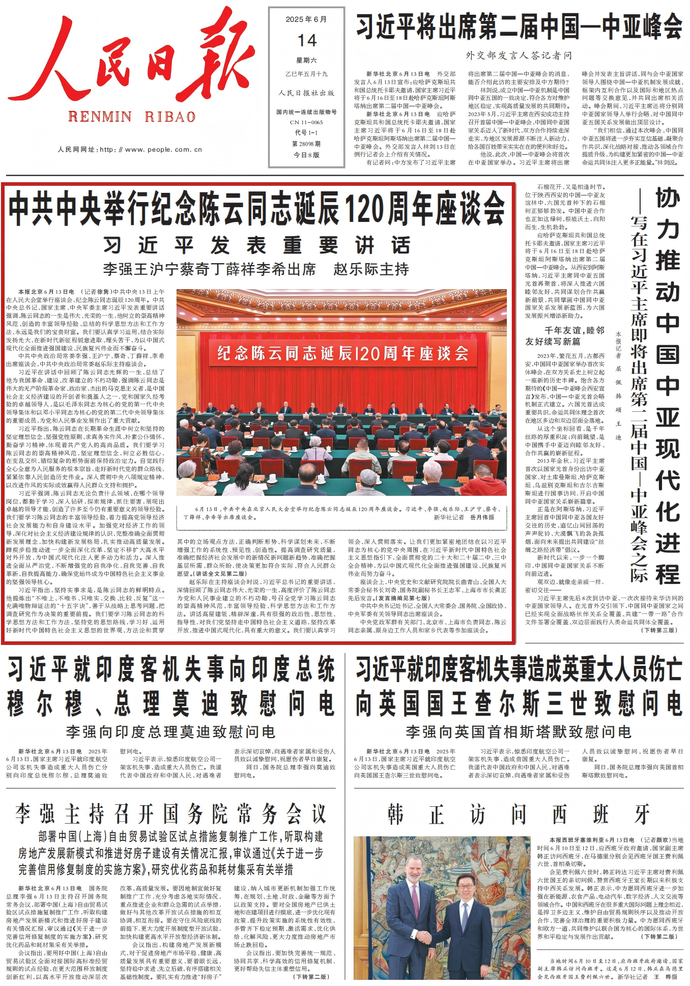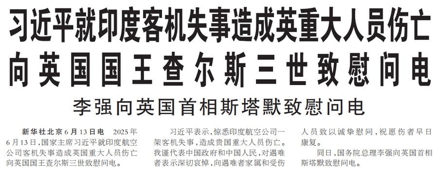 2025年6月13日,国家主席习近平就印度航空公司客机失事造成英国重大人员伤亡向英国国王查尔斯三世致慰问电。(今日《人民日报》1版)