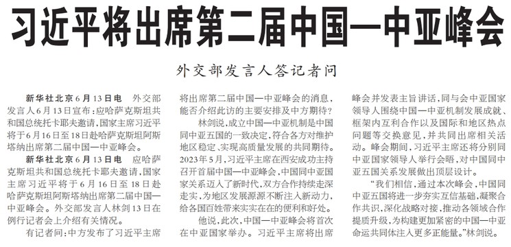 外交部发言人6月13日宣布:应哈萨克斯坦共和国总统托卡耶夫邀请,国家主席习近平将于6月16日至18日赴哈萨克斯坦阿斯塔纳出席第二届中国—中亚峰会。(今日《人民日报》1版)