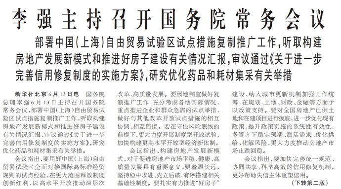 国务院总理李强6月13日主持召开国务院常务会议,部署中国(上海)自由贸易试验区试点措施复制推广工作,听取构建房地产发展新模式和推进好房子建设有关情况汇报,审议通过《关于进一步完善信用修复制度的实施方案》,研究优化药品和耗材集采有关举措。(今日《人民日报》1版、2版)