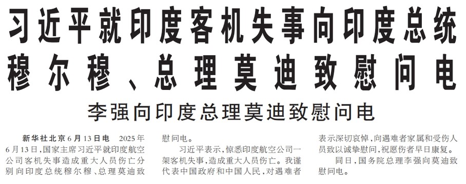 2025年6月13日,国家主席习近平就印度航空公司客机失事造成重大人员伤亡分别向印度总统穆尔穆、总理莫迪致慰问电。(今日《人民日报》1版)