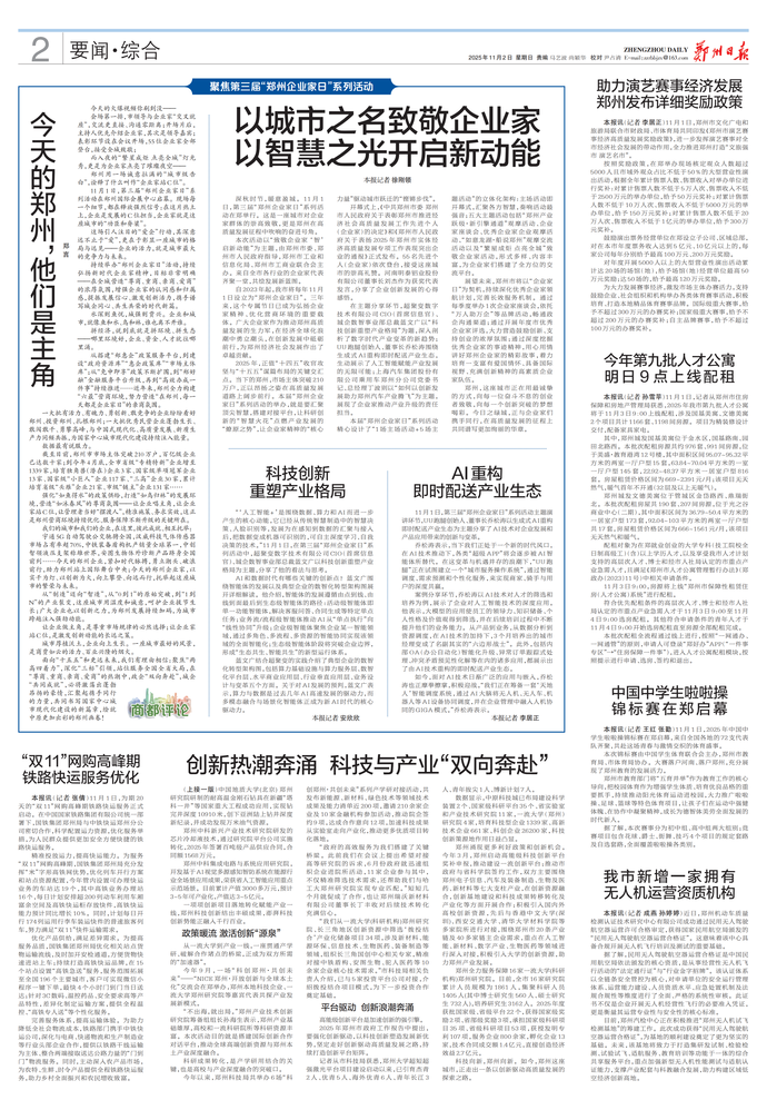 深秋时节,暖意盈城。11月1日,第三届“郑州企业家日”系列活动在郑举行。这是一座城市对企业家群体的崇高致敬,更是郑州在高质量发展征程中吹响的奋进号角。(今日《郑州日报》2版)