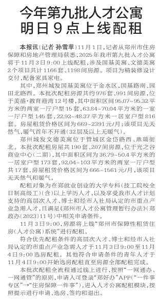 11月1日,记者从郑州市住房保障和房地产管理局获悉,2025年我市第九批人才公寓将于11月3日9:00上线配租,涉及国基美寓、文德美寓2个项目共计1166套、1198间房源。项目为精装修设计交付,配备家具家电。(今日《郑州日报》2版)