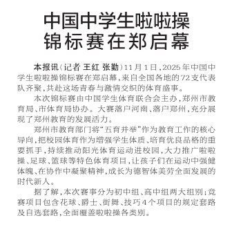 11月1日,2025年中国中学生啦啦操锦标赛在郑启幕,来自全国各地的72支代表队齐聚,共赴这场青春与激情交织的体育盛事。(今日《郑州日报》2版)