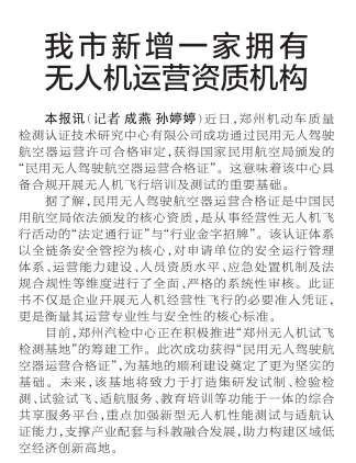 近日,郑州机动车质量检测认证技术研究中心有限公司成功通过民用无人驾驶航空器运营许可合格审定,获得国家民用航空局颁发的“民用无人驾驶航空器运营合格证”。这意味着该中心具备合规开展无人机飞行培训及测试的重要基础。(今日《郑州日报》2版)