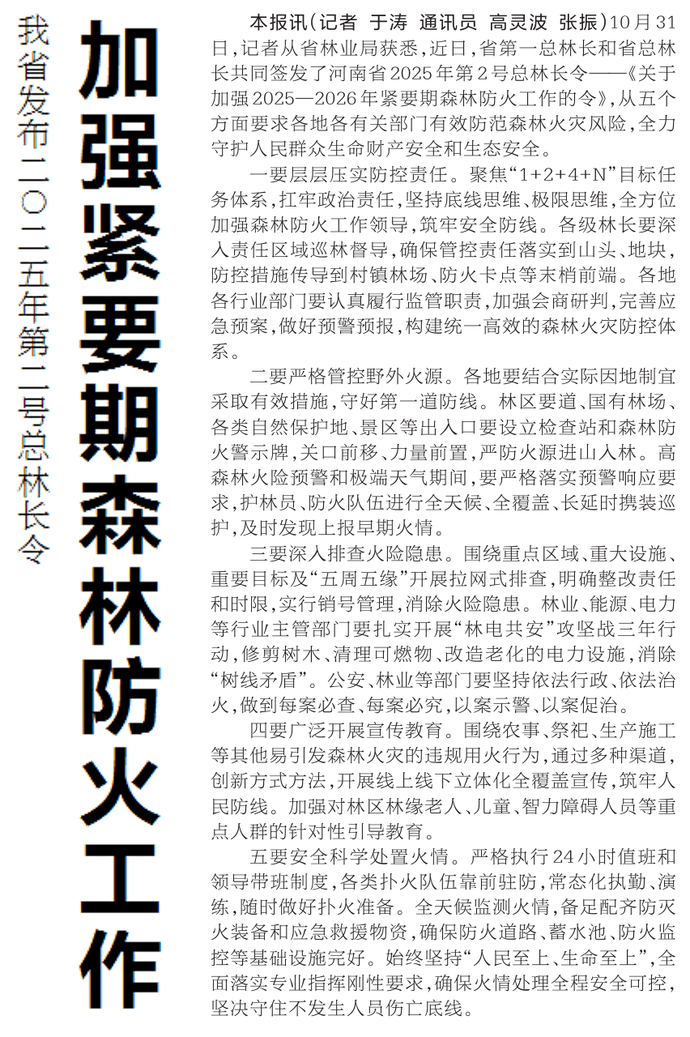 10月31日,记者从省林业局获悉,近日,省第一总林长和省总林长共同签发了河南省2025年第2号总林长令——《关于加强2025—2026年紧要期森林防火工作的令》,从五个方面要求各地各有关部门有效防范森林火灾风险,全力守护人民群众生命财产安全和生态安全。(今日《河南日报》3版)