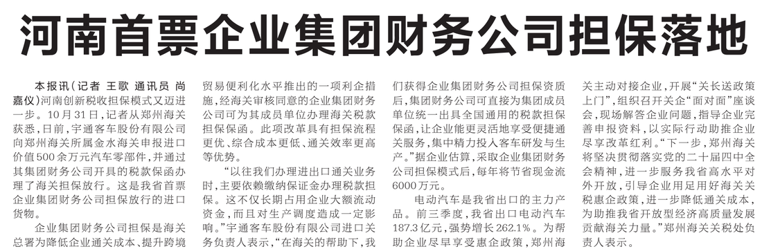 河南创新税收担保模式又迈进一步。10月31日,记者从郑州海关获悉,日前,宇通客车股份有限公司向郑州海关所属金水海关申报进口价值500余万元汽车零部件,并通过其集团财务公司开具的税款保函办理了海关担保放行。这是我省首票企业集团财务公司担保放行的进口货物。(今日《河南日报》3版)