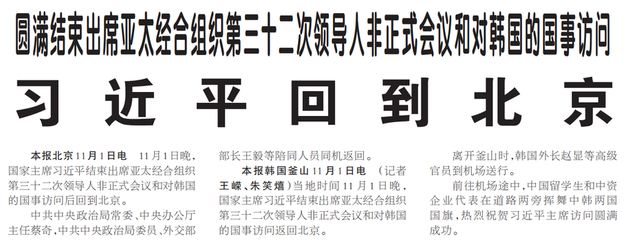 11月1日晚,国家主席习近平结束出席亚太经合组织第三十二次领导人非正式会议和对韩国的国事访问后回到北京。(今日《人民日报》1版)