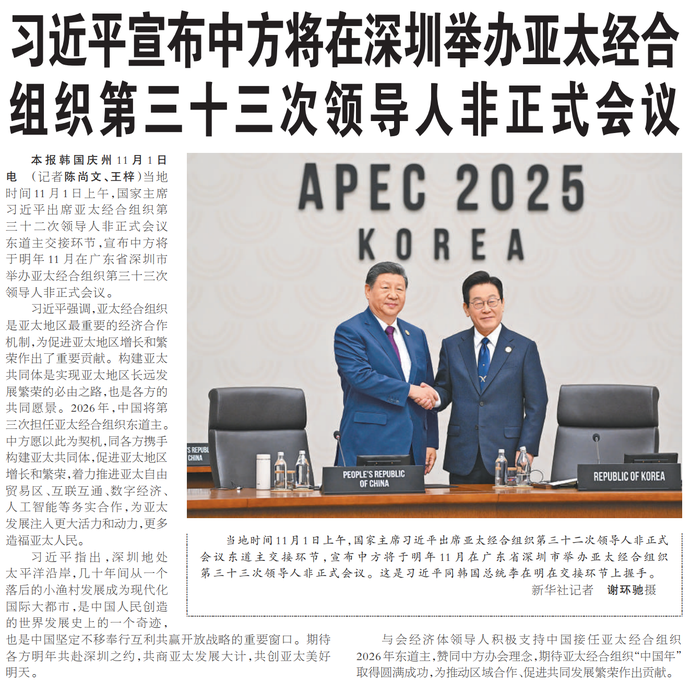 当地时间11月1日上午,国家主席习近平出席亚太经合组织第三十二次领导人非正式会议东道主交接环节,宣布中方将于明年11月在广东省深圳市举办亚太经合组织第三十三次领导人非正式会议。(今日《人民日报》1版)