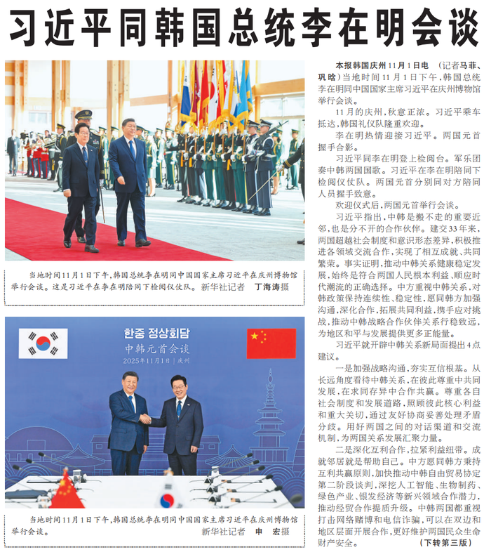 当地时间11月1日下午,韩国总统李在明同中国国家主席习近平在庆州博物馆举行会谈。(今日《人民日报》1版、3版)