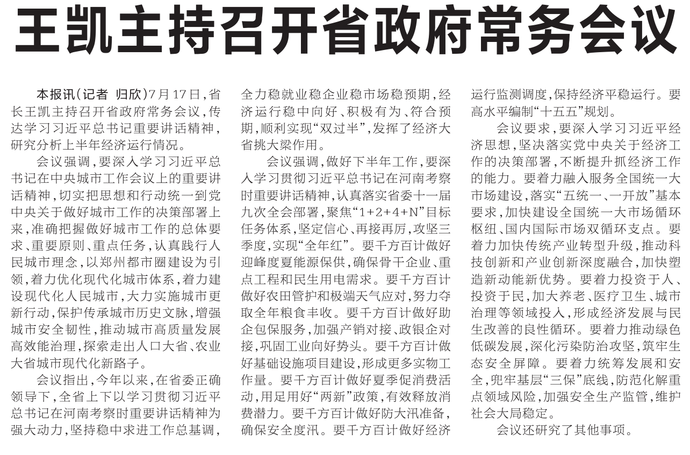 7月17日,省长王凯主持召开省政府常务会议,传达学习习近平总书记重要讲话精神,研究分析上半年经济运行情况。(今日《河南日报》1版)