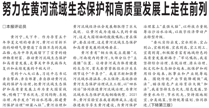 黄河宁,天下平。作为孕育五千年华夏文明的母亲河,黄河以百折不挠的磅礴气势塑造了自强不息的民族品格,也为中华民族留下了宝贵的精神物质财富。推动黄河流域生态保护和高质量发展,是事关中华民族伟大复兴和永续发展的千秋大计。(今日《河南日报》1版、3版)