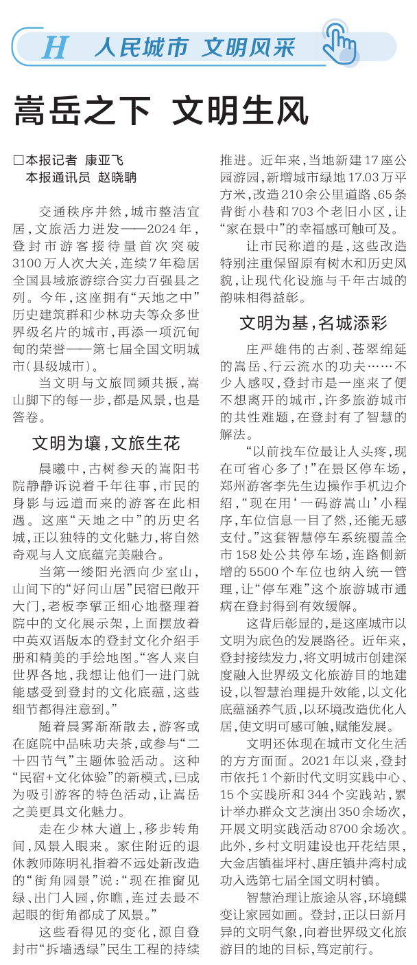 交通秩序井然,城市整洁宜居,文旅活力迸发——2024年,登封市游客接待量首次突破3100万人次大关,连续7年稳居全国县域旅游综合实力百强县之列。今年,这座拥有“天地之中”历史建筑群和少林功夫等众多世界级名片的城市,再添一项沉甸甸的荣誉——第七届全国文明城市(县级城市)。(今日《河南日报》2版)