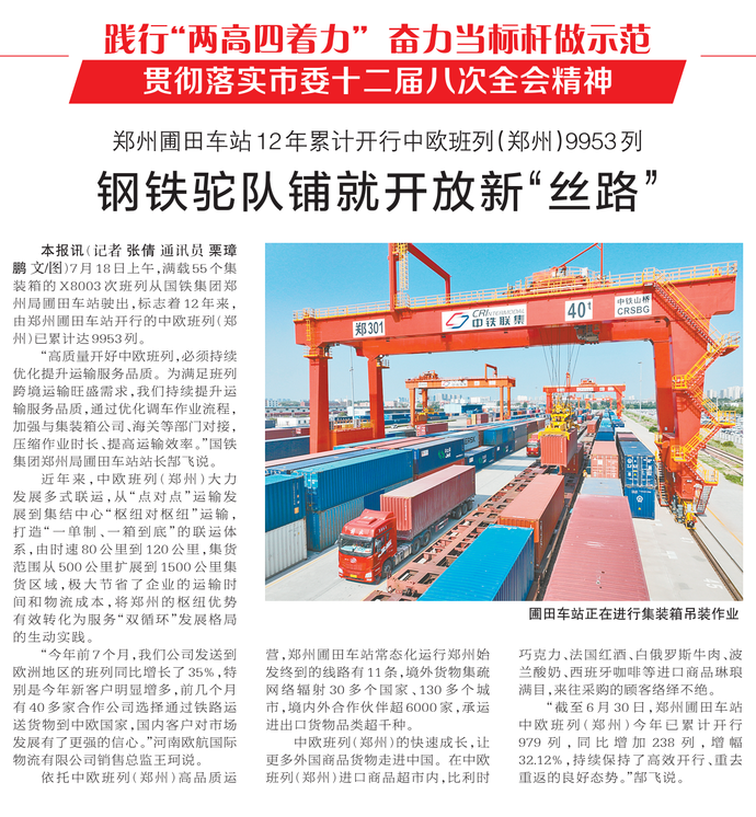 7月18日上午,满载55个集装箱的X8003次班列从国铁集团郑州局圃田车站驶出,标志着12年来,由郑州圃田车站开行的中欧班列(郑州)已累计达9953列。(今日《郑州日报》2版)