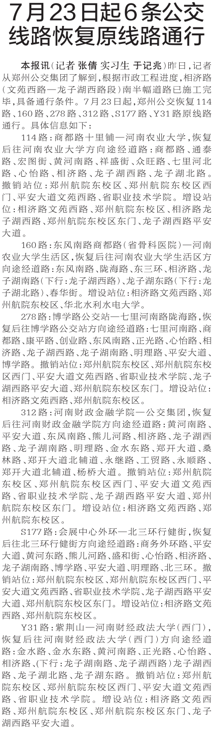 昨日,记者从郑州公交集团了解到,根据市政工程进度,相济路(文苑西路—龙子湖西路段)南半幅道路已施工完毕,具备通行条件。7月23日起,郑州公交恢复114路、160路、278路、312路、S177路、Y31路原线路通行。具体信息如下:
