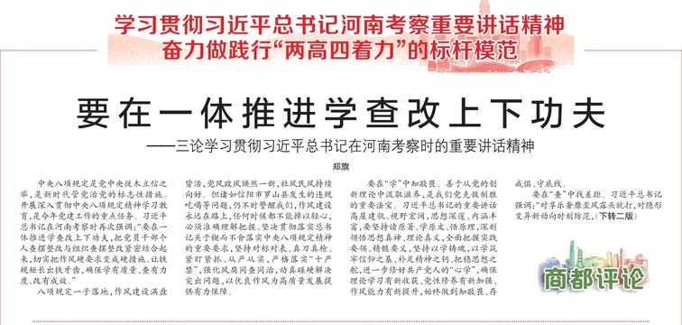 “开展深入贯彻中央八项规定精神学习教育,是今年党建工作的重点任务。”学习贯彻习近平总书记在河南考察时的重要讲话精神,我们要在一体推进学查改上下功夫,把党员干部个人查摆整改与组织查摆整改紧密结合起来,确保学有质量、查有力度、改有成效。(今日《河南日报》1版)