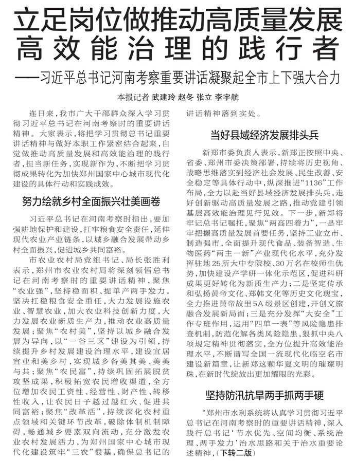 连日来,我市广大干部群众深入学习贯彻习近平总书记在河南考察时的重要讲话精神。大家表示,将把学习贯彻总书记重要讲话精神与做好本职工作紧密结合起来,自觉做推动高质量发展和高效能治理的践行者,担当新任务,实现新作为,不断把学习贯彻成果转化为加快郑州国家中心城市现代化建设的具体行动和实践成效。(今日《郑州日报》1版、2版)
