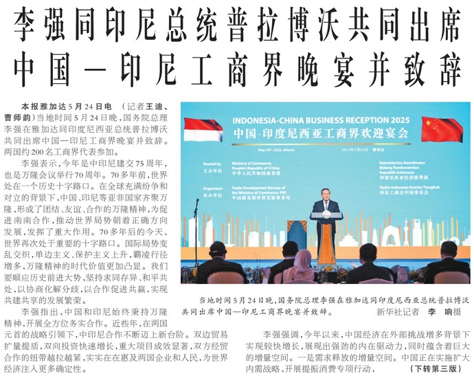 当地时间5月24日晚,国务院总理李强在雅加达同印度尼西亚总统普拉博沃共同出席中国—印尼工商界晚宴并致辞。两国约200名工商界代表参加。(今日《人民日报》1版、3版)