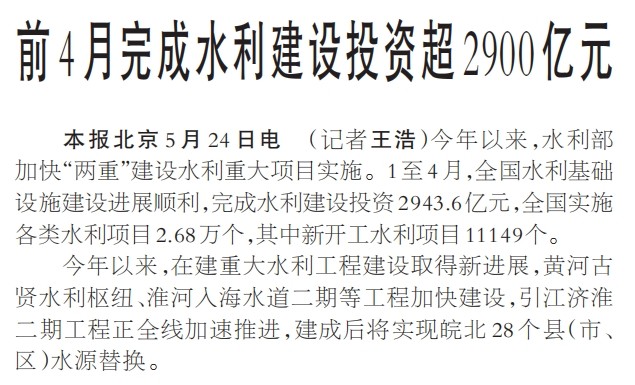 前4月完成水利建设投资超2900亿元