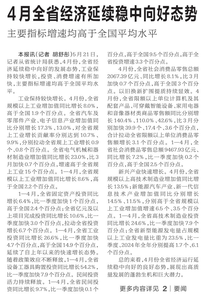 5月21日,记者从省统计局获悉,4月份,全省经济延续稳中向好的发展态势,工业保持较快增长,投资、消费增速有所加快,主要指标增速均高于全国平均水平。(今日《河南日报》1版、2版)