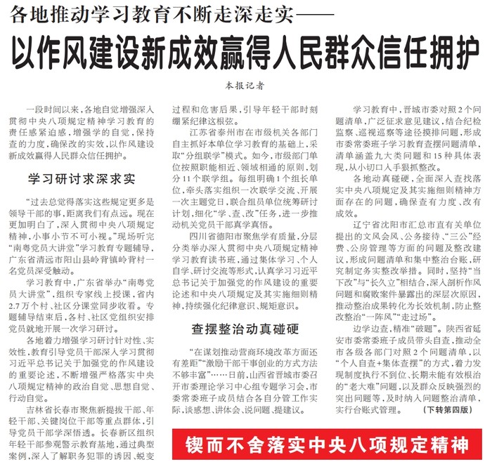 一段时间以来,各地自觉增强深入贯彻中央八项规定精神学习教育的责任感紧迫感,增强学的自觉,保持查的力度,确保改的实效,以作风建设新成效赢得人民群众信任拥护。(今日《人民日报》1版、4版)