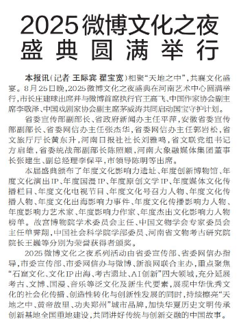 相聚“天地之中”,共襄文化盛宴。8月25日晚,2025微博文化之夜盛典在河南艺术中心圆满举行,市长庄建球出席并与微博首席执行官王高飞、中国作家协会副主席李敬泽、中国戏剧家协会副主席茅威涛共同启动国宝守护计划。(今日《郑州日报》1版)