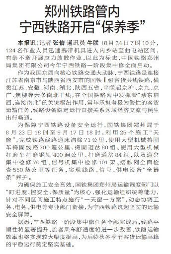 郑州铁路管内宁西铁路开启“保养季”