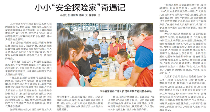 儿童食品和学生用品安全关系到儿童的健康成长。8月22日,郑州市第二届儿童友好观察团成员走进丹尼斯·大卫城拜特超市开展“‘童’行守护,共为安全”活动,学习如何选择安全可靠的儿童和学生用品,进一步提升安全意识。(今日《郑州日报》2版)