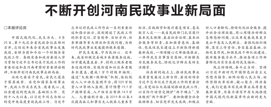 中国式现代化,民生为大。8月25日,第十九次全省民政会议在郑州召开,总结近年来全省民政事业发展成效,安排当前和今后一个时期全省民政工作。各级党委和政府要深入学习贯彻习近平总书记关于民政工作的重要论述和在河南考察时重要讲话精神,不断开创河南民政事业新局面。(今日《河南日报》1版)