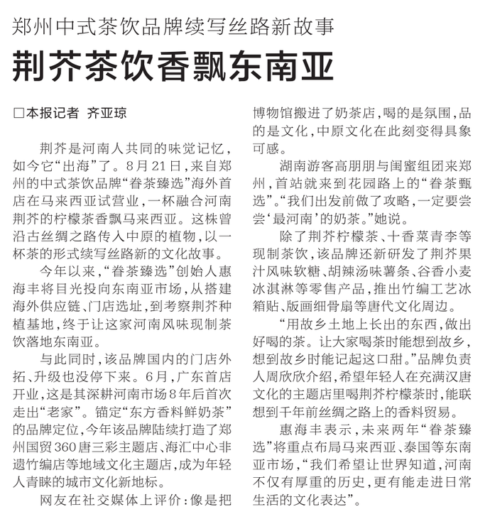 荆芥是河南人共同的味觉记忆,如今它“出海”了。8月21日,来自郑州的中式茶饮品牌“眷茶臻选”海外首店在马来西亚试营业,一杯融合河南荆芥的柠檬茶香飘马来西亚。这株曾沿古丝绸之路传入中原的植物,以一杯茶的形式续写丝路新的文化故事。(今日《河南日报》1版)