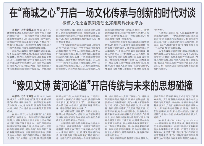 8月25日,2025微博文化之夜圆桌对话“豫见文博 黄河论道”在郑州博物馆举行。在郑州这片千年文脉滋养之地,考古学者、博物馆专家齐聚一堂,开启了一场传统与未来的文明思想碰撞。(今日《郑州日报》8版)
