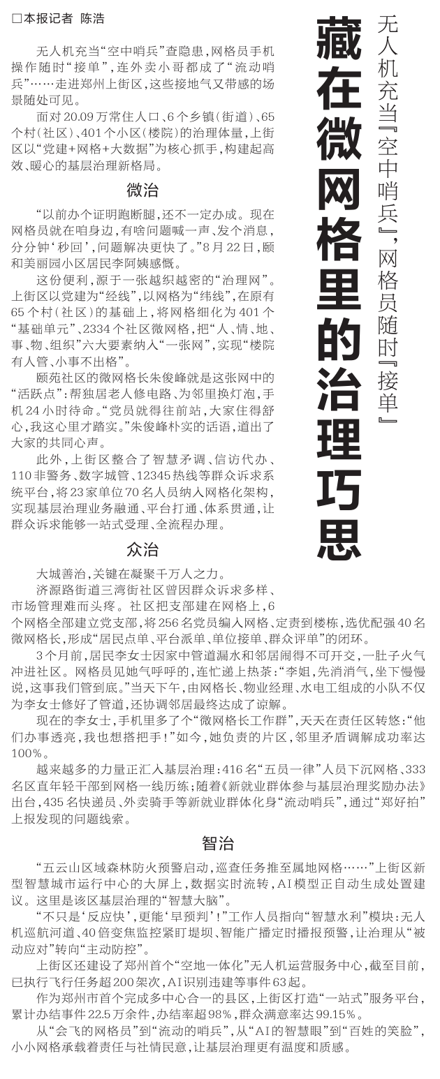 无人机充当“空中哨兵”查隐患,网格员手机操作随时“接单”,连外卖小哥都成了“流动哨兵”……走进郑州上街区,这些接地气又带感的场景随处可见。(今日《河南日报》4版)