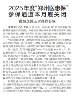 4月30日,2025年度“郑州医惠保”参保缴费通道即将关闭。为避免因错过集中参保缴费期影响相应医疗保险待遇,提醒符合条件的城乡居民及时办理,逾期将无法补办。这是记者昨日从市医疗保障局获得的信息。(今日《郑州日报》1版)
